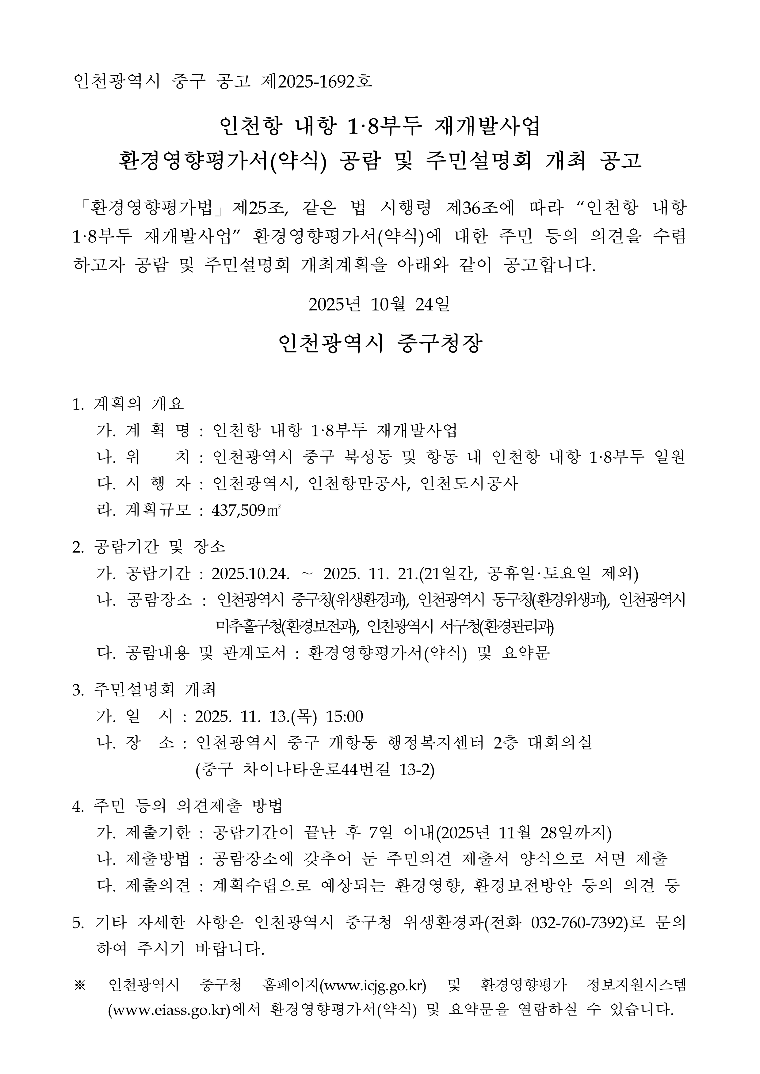 [인천광역시 중구 공고 제2025-1692호] 인천항 내항 1ㆍ8부두 재개발사업 환경영향평가서 공람 및 주민설명회 개최 공고