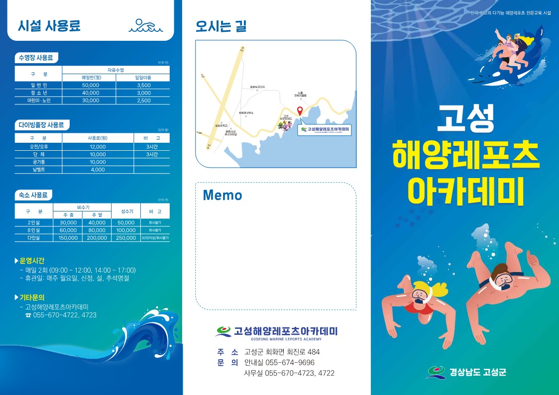 - 접수방법: 인터넷 접수〔고성군 홈페이지 https://www.goseong.go.kr/ - 통합예약 ? 시설공유?대관 ? 체육시설 ? 고성해양레포츠아카데미(잠수풀)〕