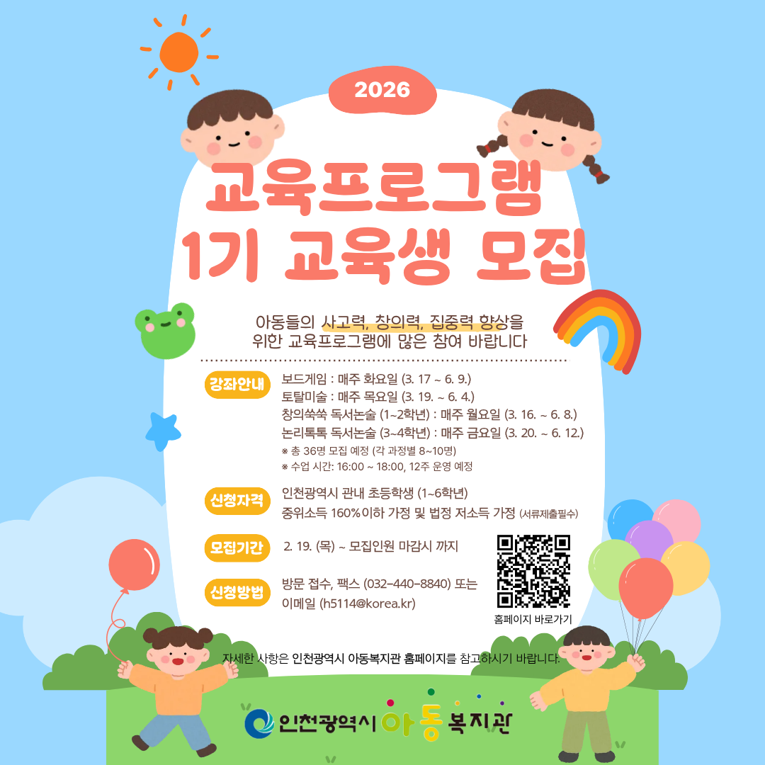 인천광역시 아동복지관 「2026년도 제1기 아동교육프로그램 」 안내