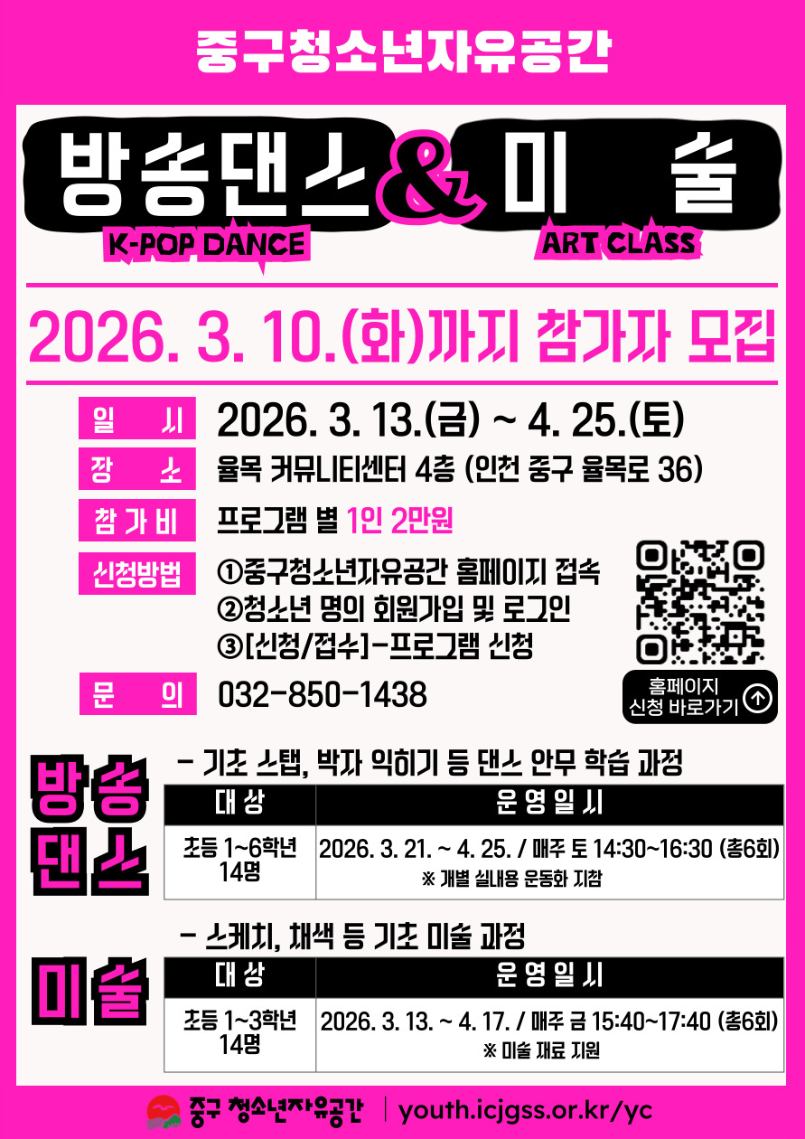 중구청소년자유공간 3월 방송댄스 및 미술 프로그램 참가자 모집