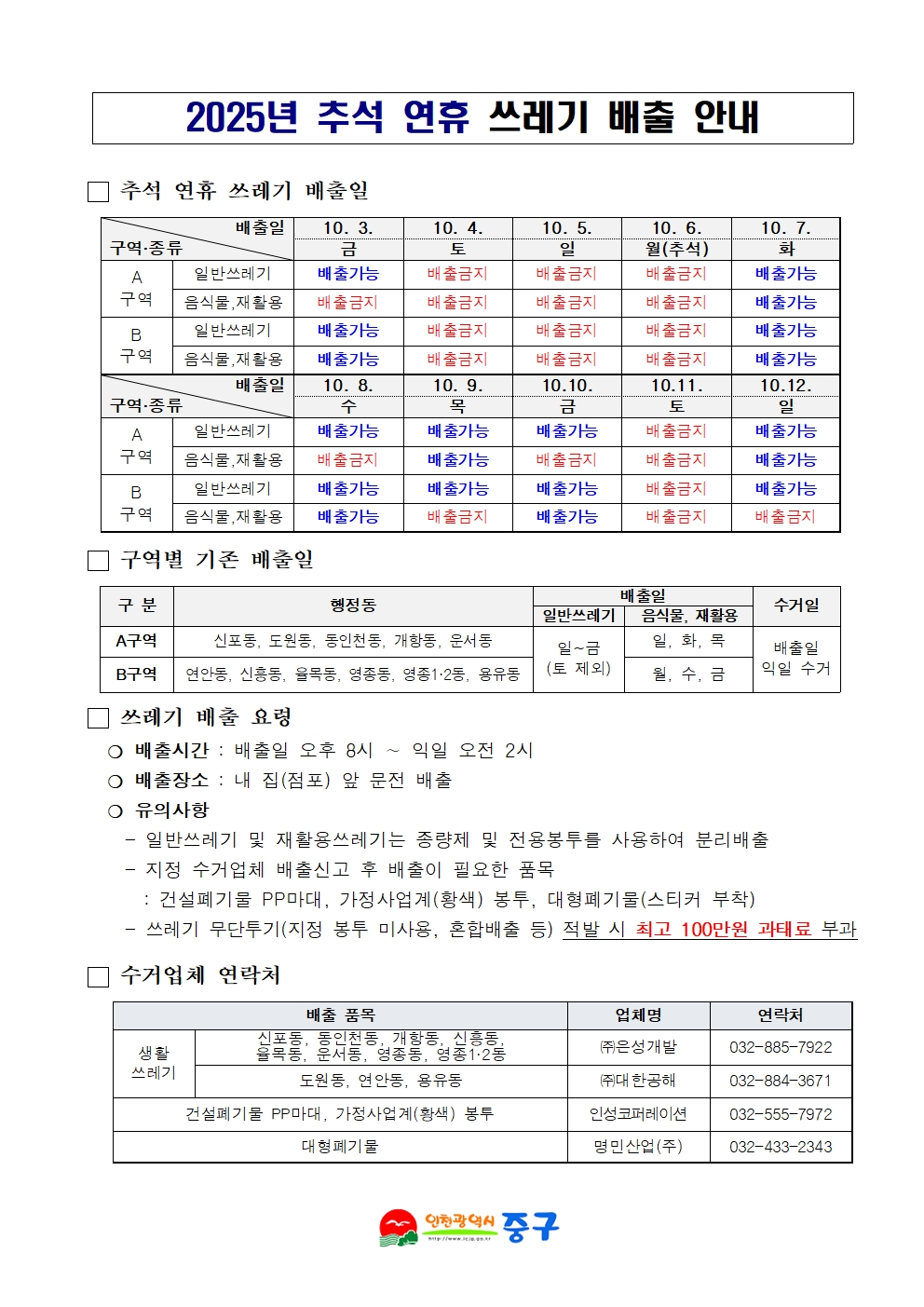 2025년 추석 연휴 쓰레기 배출 안내