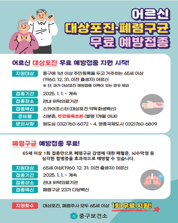 어르신 대상포진, 폐렴구균 무료 예방접종 안내