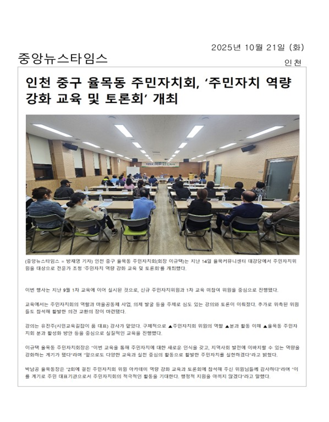 보도자료 : 주민자치회 '주민자치 역량강화 교육 및 토론회' 개최