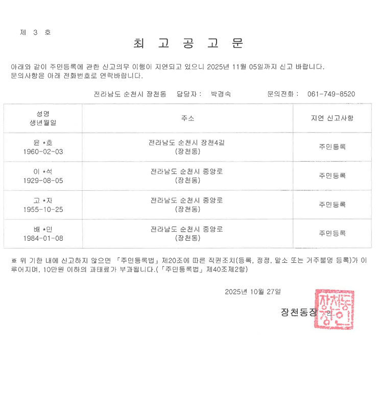 주민등록에 관한 신고의무 이행 지연 최고공고문(2025. 10. 27.)