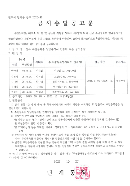 신규 주민등록증 발급통지서 반송에 따른 공시송달 공고