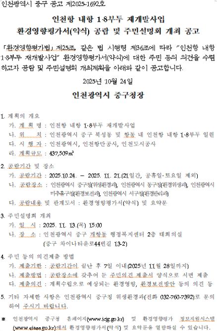 인천항 내항 1.8부두 재개발사업 환경영향평가(약식)공람 및 주민설명회 개최 공고