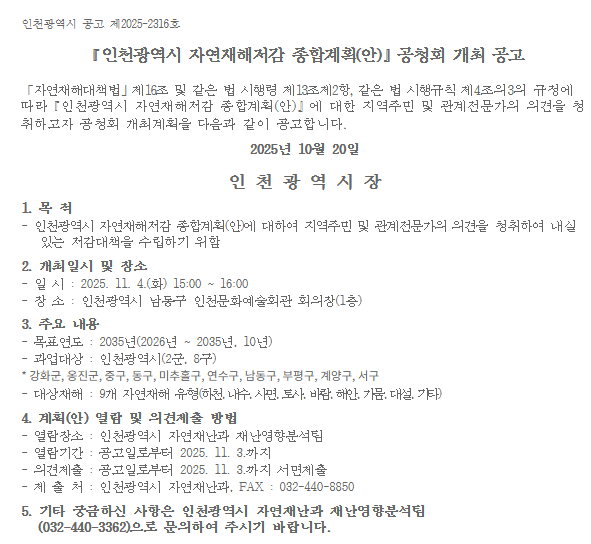인천광역시 자연재해저감 종합계호기(안) 공청회 개최 공고