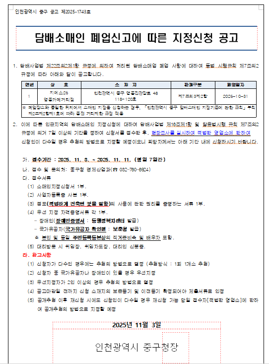 담배소매인 폐업신고에 따른 지정신청 공고(부칙적용)(2025. 10. 31)