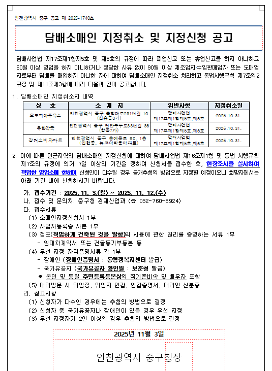 담배소매인 지정취소 및 지정신청 공고(2025. 10. 31.)