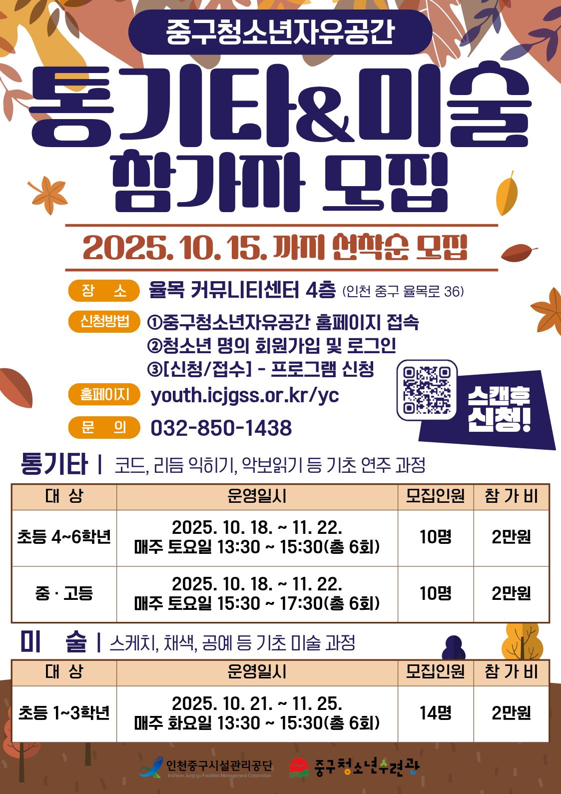 중구청소년자유공간 10~11월 통기타 및 미술 프로그램 참가자 모집