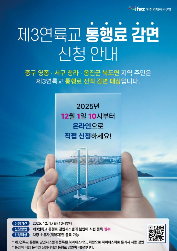 ❶ 통행료 감면 대상은? - (감면대상) 지역주민이 소유한 차량이며, 시스템 사전 등록 필수 ·「주민등록법」에 따른 주민등록상 주소지가 중구(중산동, 운남동, 운북동, 운서동, 을왕동, 남북동, 덕교동, 무의동), 옹진군(북도면), 서구(청라 1ㆍ2ㆍ3동)에 있는 자가 소유하는 차량으로, 통행료 감면시스템에 사전 등록된 차량 ※ 차종의 구분 없음 - (감면규모) 제한 없음 ※ 감면비율: 100분의 100 - (감면제외) 통행료 감면시스템에 사전 등록되지 않은 차량, 단체 및 법인 소유 차량(법인택시 제외), 단기(1년 미만) 렌탈ㆍ리스 차량 ※ 1년 이상의 렌탈·리스차량 사전 등록 시 계약서 반드시 첨부 - (감면시기) 감면시스템 사전 등록 후 다음 날 0시 감면 ※ 문자 자동 전송 ·렌트·리스차량은 서류 검토 기간 필요 ❷ 통행료 감면 신청방법은? - (신청기간) 2025년 12월 1일 10시부터 - (신청방법) 제3연륙교 통행료 감면 시스템에 본인이 직접 등록 필수 ·전입신고 후 제3연륙교 통행료 감면 시스템(https://intoll.incheon.go.kr/tlb)에서 신청