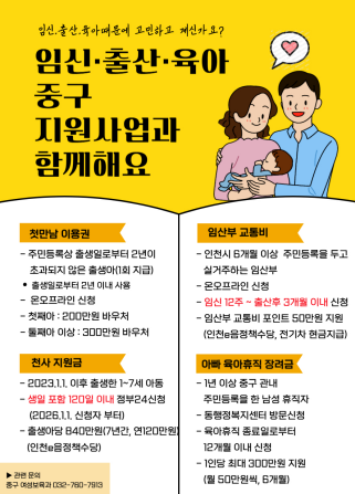 인천시 중구 출산 및 양육지원 사업 관련 포스터를 첨부하오니 참고하시기 바랍니다.