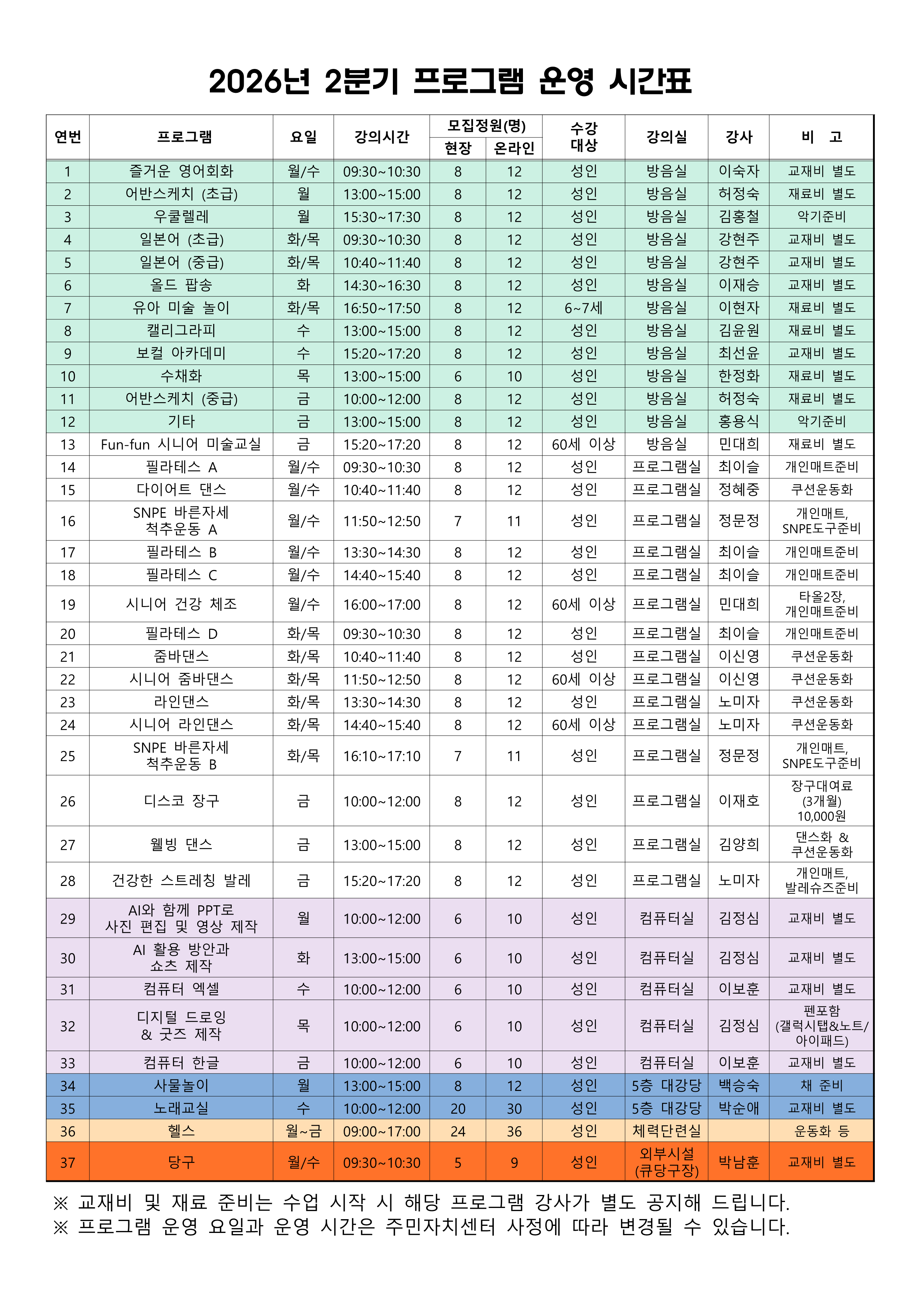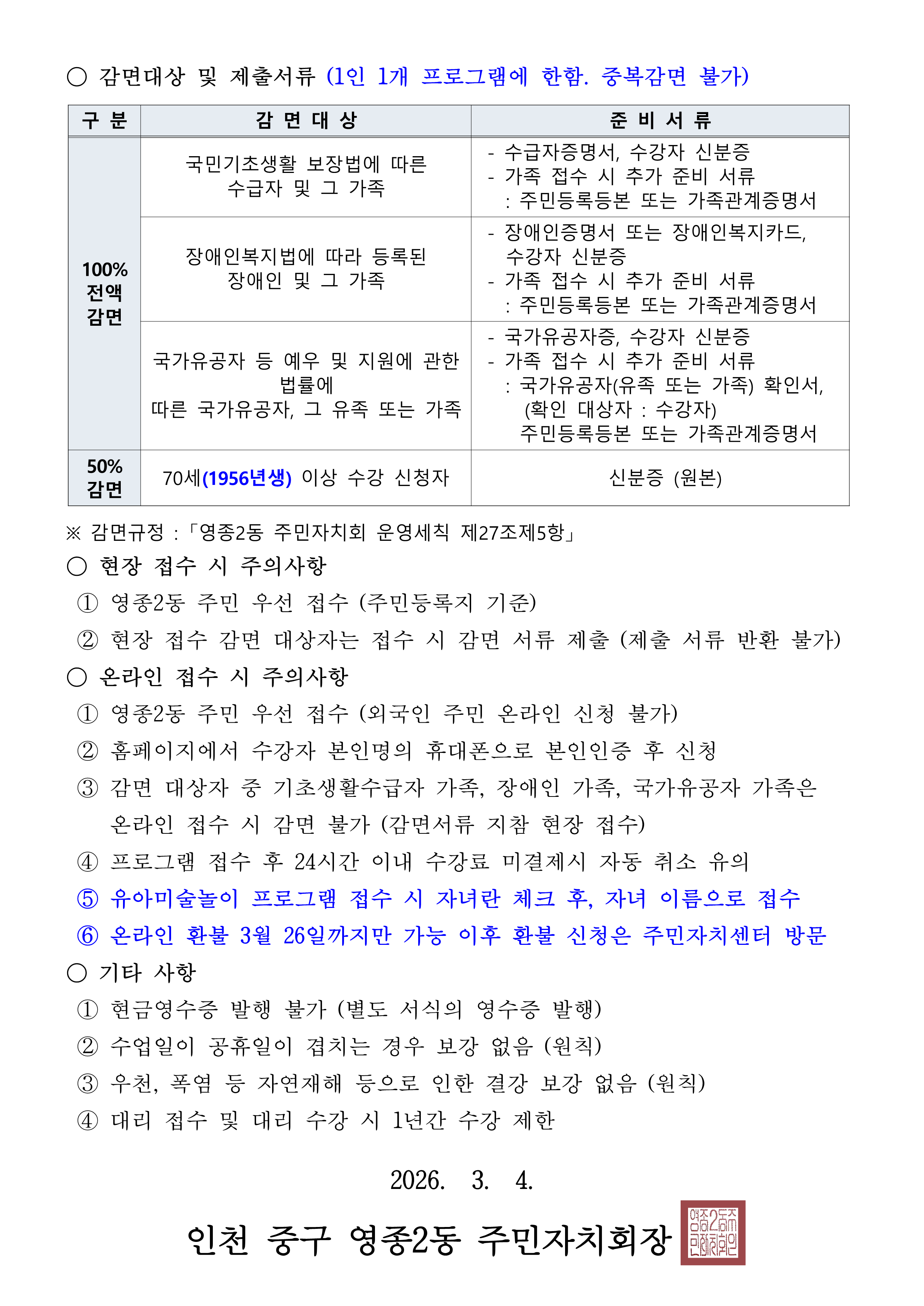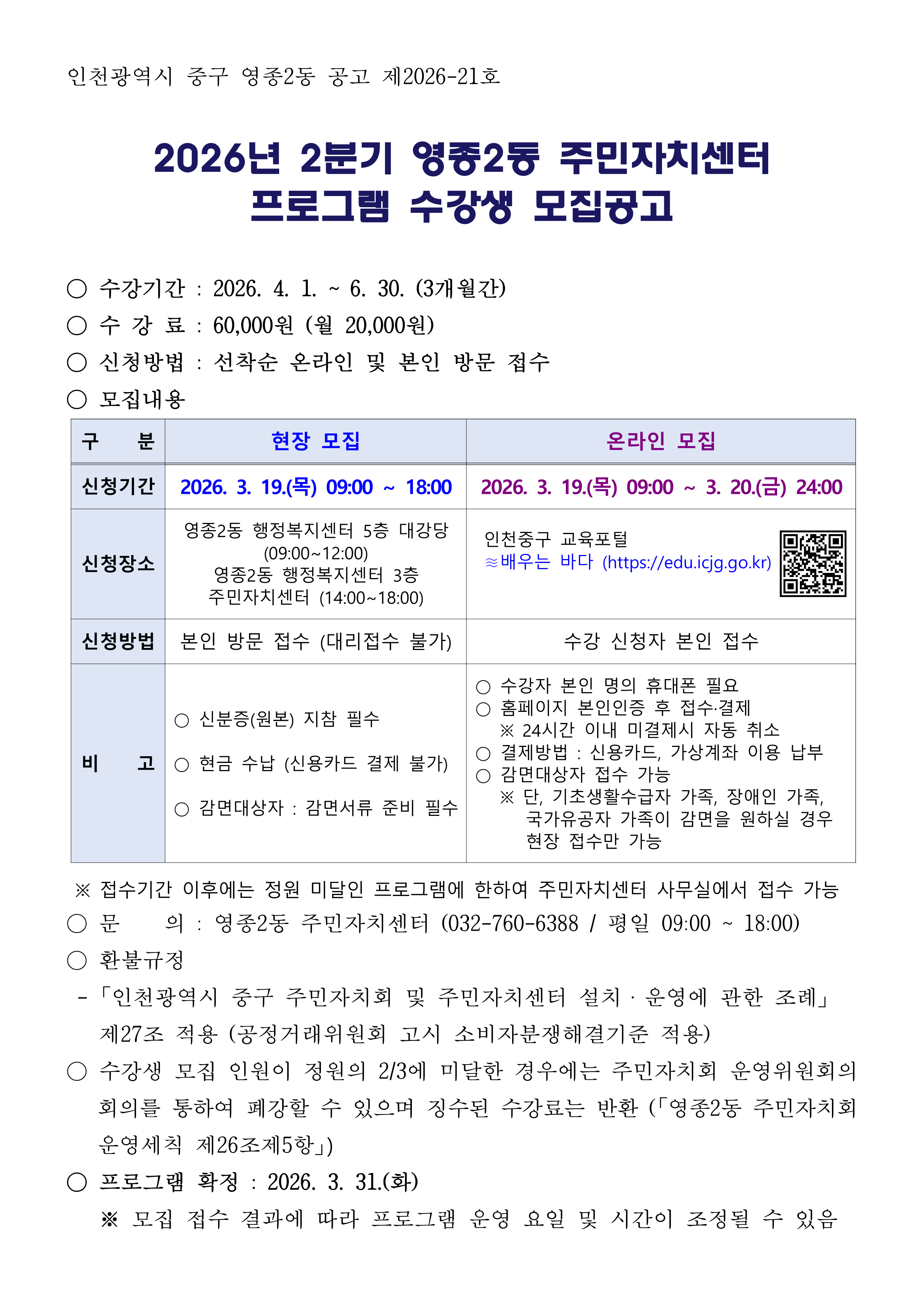 2026년 2분기 영종2동 주민자치센터 프로그램 수강생 모집 안내