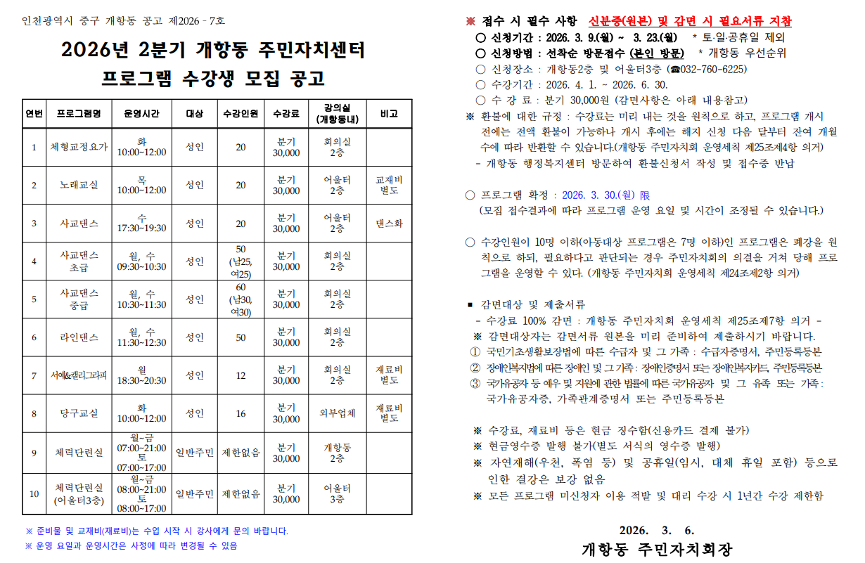 2026년 2분기 개항동 주민자치 프로그램 시간표