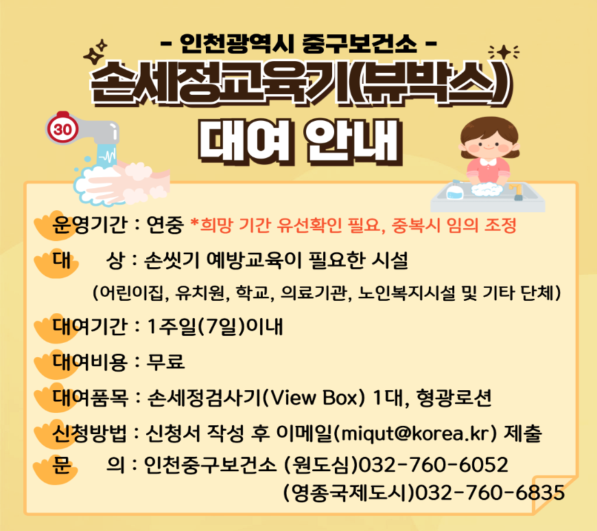 - 대여물품 : 손세정교육기 및 형광로션, 교육자료 등