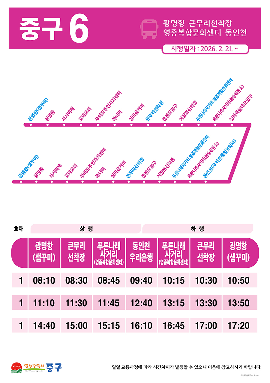 [중구 6] 중구 공영버스 노선도 및 운행시간표 안내(2026. 2. 21. 자 시행)