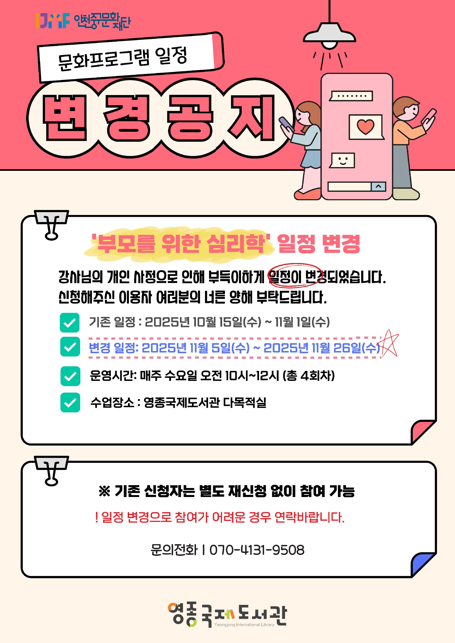 영종국제도서관 '부모를 위한 심리학' 프로그램 일정 변경 안내