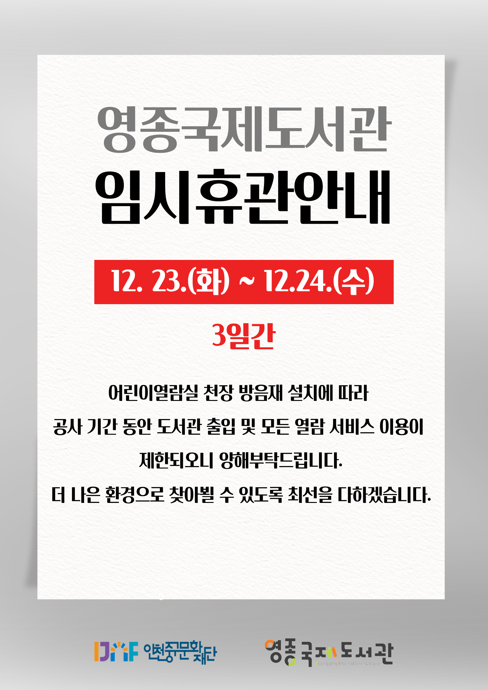 휴관 기간: 2025년 12월 22일(월) ~ 12월 24일(수) (3일간)